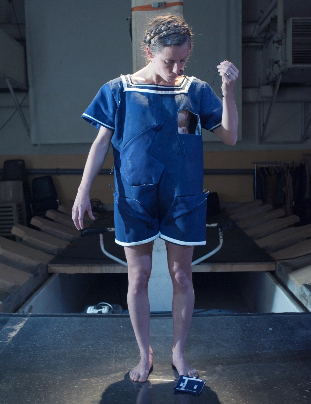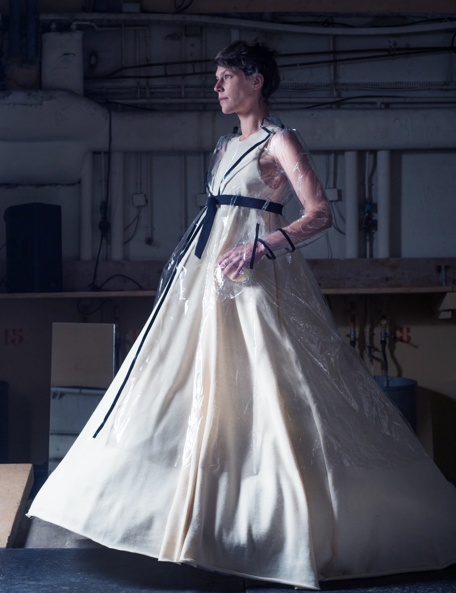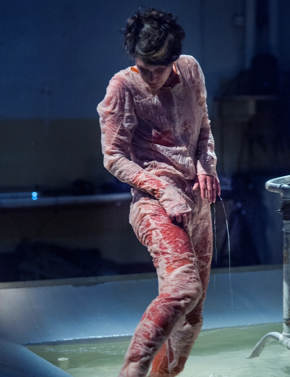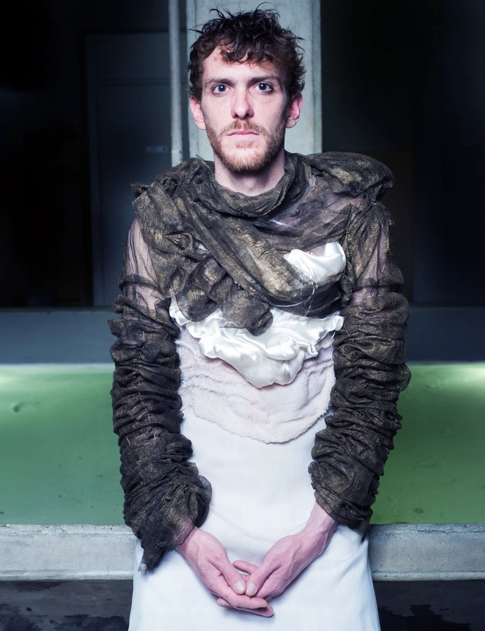 Elaborer une silhouette évolutive par interaction avec l’eau et le jeu d’un interprète. Commencer par des explorations plastiques, par des expériences avec des tissus. Observer leurs transformations possibles par interaction avec l’eau. Se laisser conduire par la matière pour concevoir l’esthétique et l’utilisation. Adapter la coupe et les techniques d’assemblages en fonction.