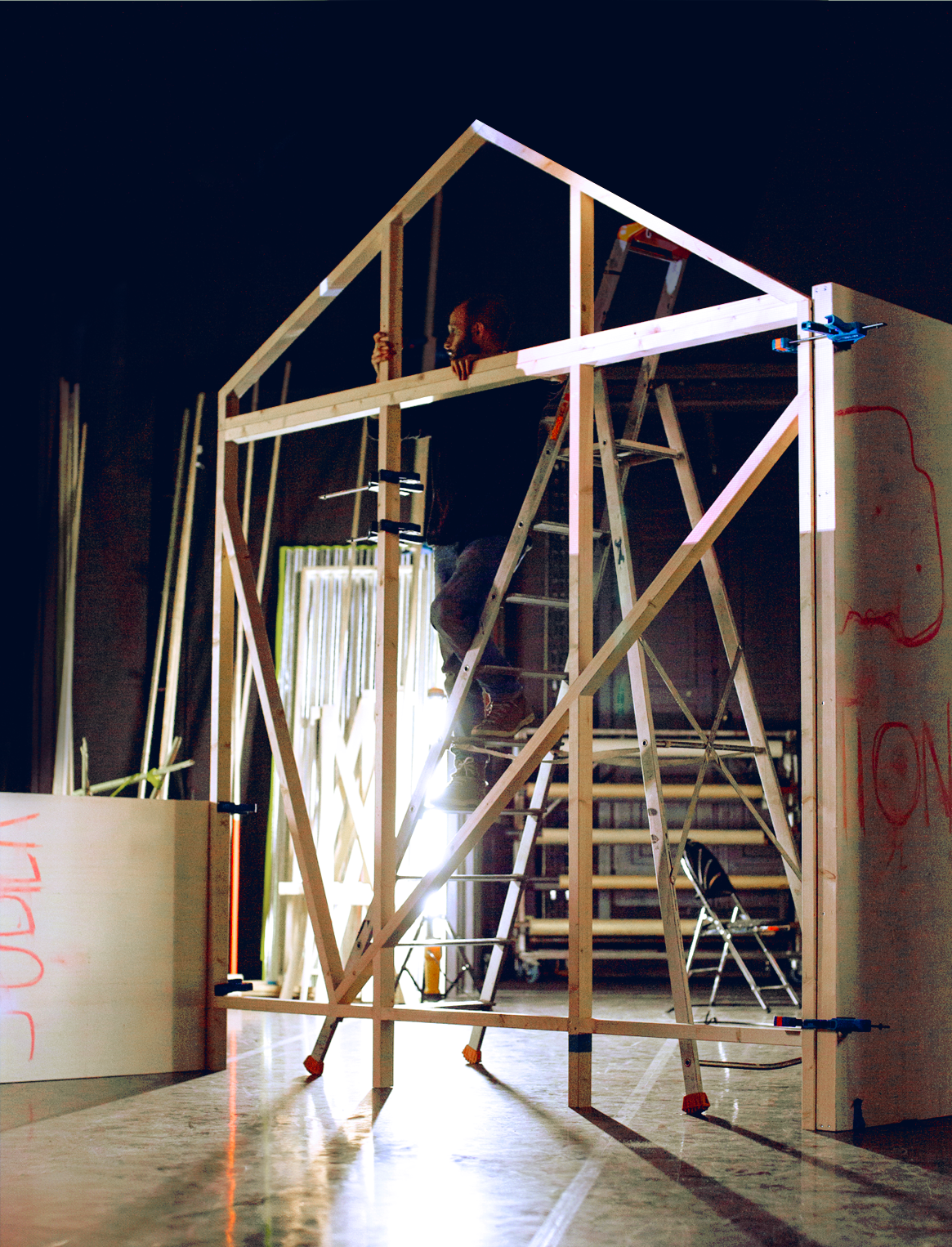 en référence au texte de Martin Heidegger Bâtir, Habiter, Penser. Celui-ci décrit comment ces trois actions sont liées et participent d’un même ensemble. Nous l’aurons comme toile de fond pour créer ce spectacle qui se propose de raconter comment l’architecture conditionne nos pensées, nos imaginations, voire nos désirs individuels et collectifs.