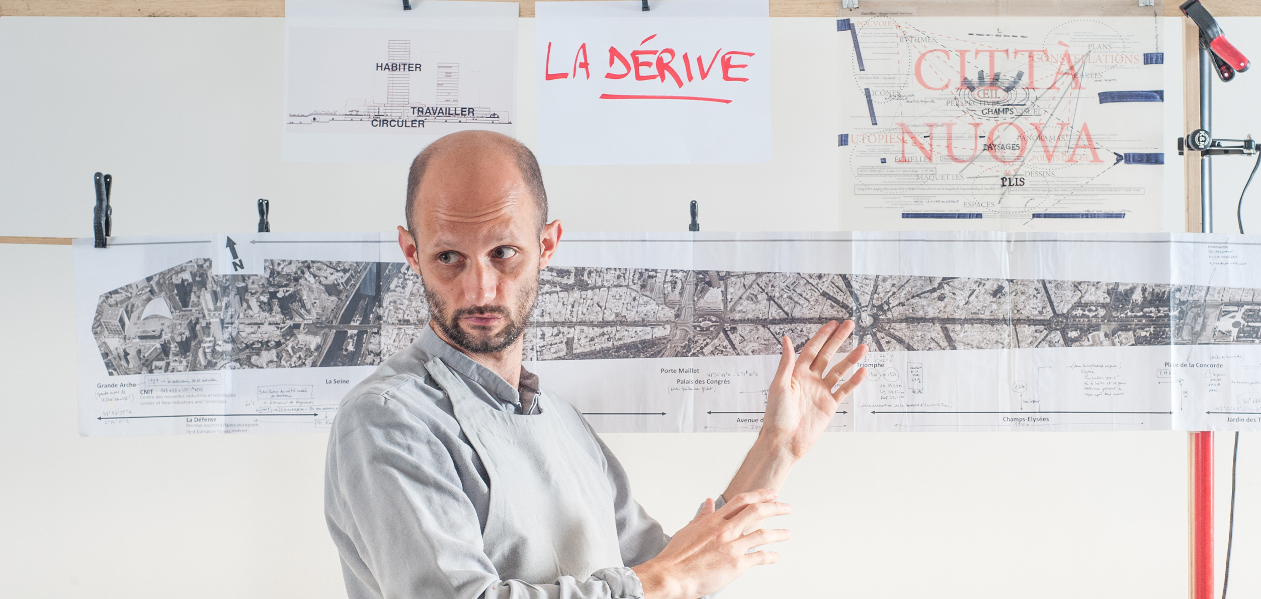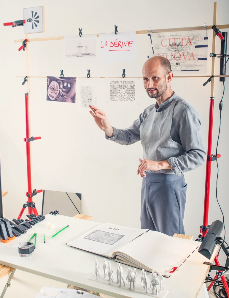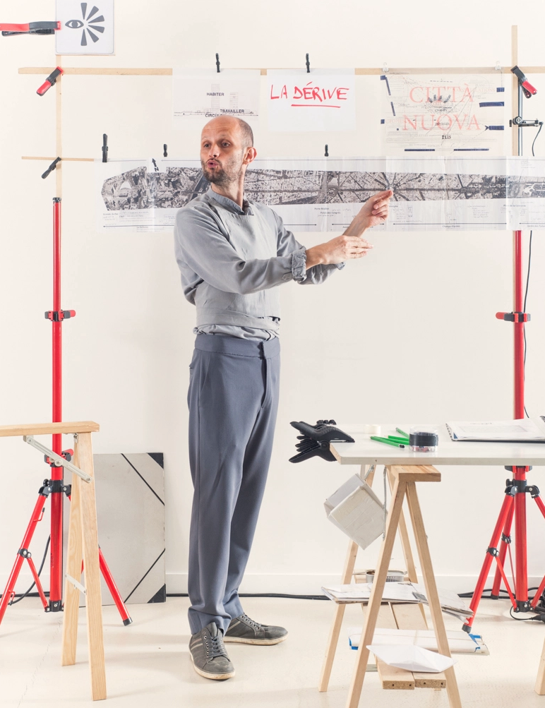 Tour à tour, l’acteur qui n’est donc pas architecte mais qui fait des plans pas seulement sur la comète, va ouvrir des carnets, déployer des cartes, des dessins (en 2 et 3D, signés Géraldine Trubert), accrocher des images, manipuler des projecteurs, ouvrir des boîtes, ordonner des dispositifs et cela tout en parlant de choses et d’autres (il ne dédaigne pas la digression) tout en nous nourrissant de citations allant de Guy Debord à Bernard Maris, de Le Corbusier à Raoul Vaneigem.